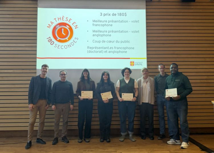 Lundi 16 mars a eu lieu à l'Université Laval le concours "Ma Thèse en 180 secondes" de la Faculté de Foresterie, de Géographie et de Géomatique. Ouvert à toutes les personnes étudiantes de la Faculté et des centres associés (CEF, CRMR, CRDIG, CEN), 14 étudiantes et étudiants ont relevé le défi de présenter en français ou en anglais leur projet de recherche en moins de trois minutes. Le jury a décerné trois prix de 180$, parmi lesquels deux prix ont été remportés par des personnes étudiantes du CEF. Marie-Anne Michaud-Valcourt a gagné le prix de la meilleure présentation francophone pour sa présentation "Quand la forêt encaisse". Jonathan Kimbukusu Kusa, qui a gagné le prix de la meilleure présentation francophone au Doctorat pour sa présentation "La forêt peut‑elle embaucher autrement avec les Premières Nations?", est sélectionné pour la finale institutionnelle de l'Université Laval. Le troisième prix a été remis à Sara Etminanrezaeieh, du CRMR. Enfin, le prix "Coup de cœur" du public (180$) a été donné à Vicky Martin, étudiante à la maîtrise du CEF, pour sa présentation "Quand le feu s'invite à l'étage".
