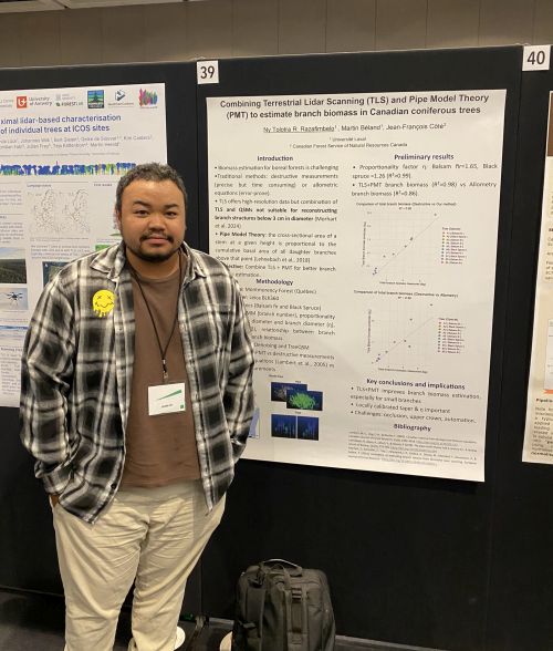 «J’ai eu le plaisir d’y présenter mon affiche portant sur une partie de mes recherches concernant la combinaison du LiDAR terrestre et de la Pipe Model Theory pour l’estimation de la biomasse ligneuse des branches des arbres de conifères. Cette conférence m’a permis d’échanger avec des spécialistes de renommée mondiale dans le domaine, ainsi que de découvrir les avancées scientifiques et les innovations les plus récentes.» Ny Tolotr Razafimbelo