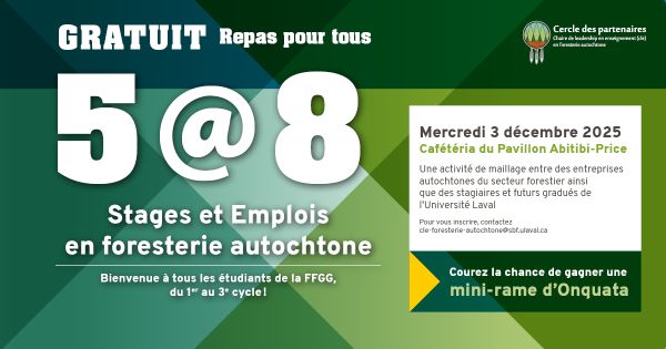 Le mercredi 3 décembre aura lieu un 5@8 Stages et Emplois en foresterie autochtone, de 17 h à 20 h, à la cafétéria du pavillon Abitibi-Price. C'est une activité de réseautage entre des entreprises forestières autochtones ou des organisations autochtones œuvrant dans le secteur forestier et des stagiaires et futurs gradués issus de programmes de foresterie, géographie, sciences géomatiques, biologie ou sciences de l’administration. Inscrivez-vous!