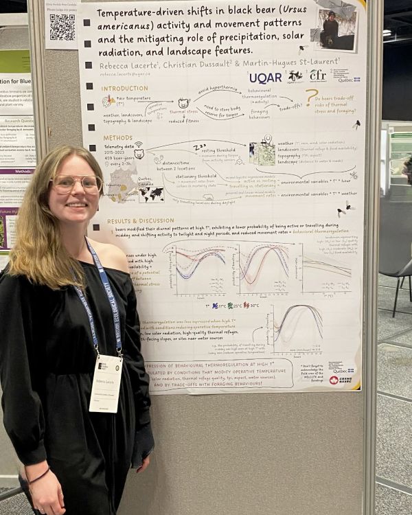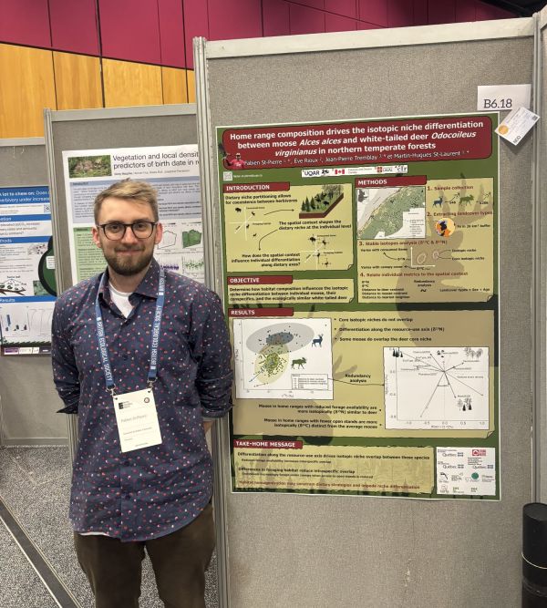 «J’ai pu y présenter sous forme d’affiche un de mes chapitres de doctorat intitulé "home range composition drives the isotopic niche differentiation between moose and white-tailed deer in northern temperate forests" ce qui m’a permis de discuter avec plusieurs étudiant.e.s/chercheur.e.s qui travaillent sur des problématiques similaires, mais dans des systèmes d’étude différents.» (Lire la suite...) Fabien St-Pierre