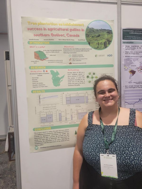 Du 20 au 24 octobre 2025, nous avons eu la chance de participer au 6e congrès mondial d'agroforesterie à Kigali, au Rwanda. Ce congrès qui a regroupé plus de 400 chercheurs, étudiants, politiciens d'à travers le monde avait pour but de faire avancer les recherches et les pratiques en matière d'agroforesterie pour avoir des systèmes résilients et durables. Sous la direction de David Rivest, nous étions deux étudiants à avoir participé à ce congrès. Antoine Magnoux y a présenté une communication orale issue de ses travaux de doctorat intitulée How far do tree windbreaks shape soils? Effects on soil organic carbon stocks and root traits. Pour ma part, j'ai participé à la séance d'affiche en présentant mon projet de maitrise intitulé Tree plantation establishment success in agricultral gullies in southern Québec, Canada. Cette expérience nous a permis d'élargir nos horizons sur l'agroforesterie à l'international et a créé des liens avec des chercheurs qui travaillent sur des projets similaires sous d'autres climats. Nous tenons à remercier le CEF et notre direction, David Rivest, pour le soutien financier, qui nous a permis de réaliser cette belle expérience.