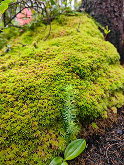 Semis d'épinette noire (Picea mariana), sur un lit de germination de Sphagnum sp. Photo Maximilien Vidal.
